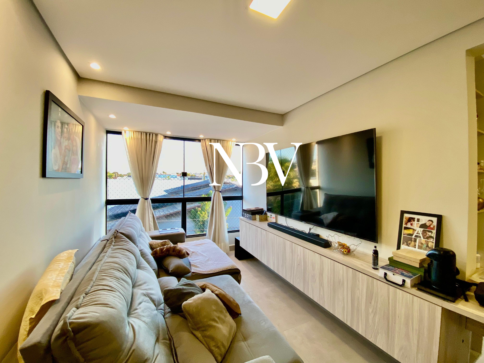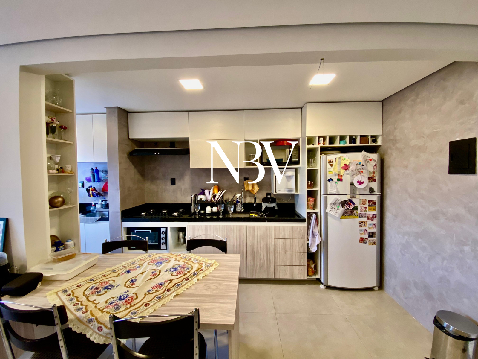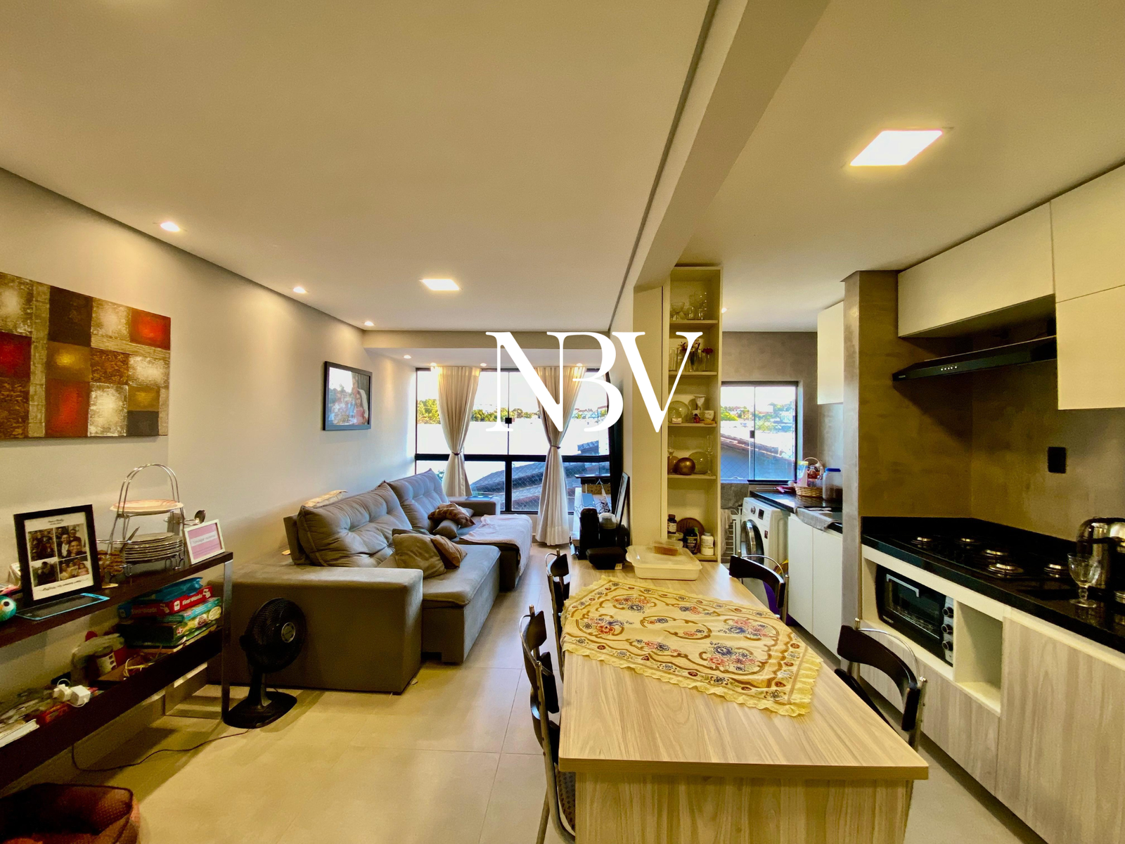 Sala ampla integrada com a cozinha e área de serviço completa em móveis planejados;
